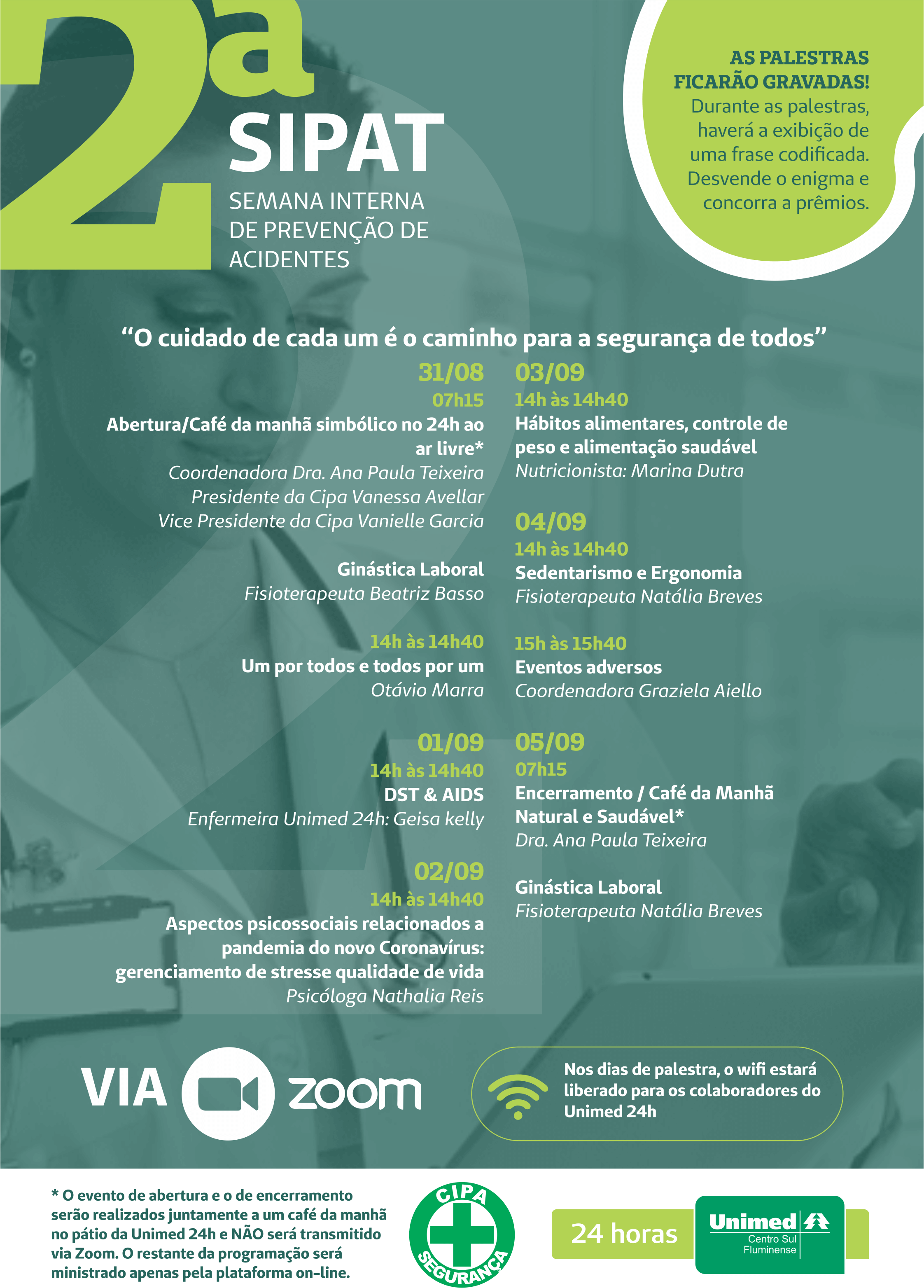 Buscando evitar aglomerações e com respeito ao isolamento social, a equipe da CIPA da Unimed 24h da Unimed Centro Sul Fluminense realizou sua segunda edição da Semana Interna de Prevenção de Acidentes de Trabalho (SIPAT), entre os dias 31 de agosto e 5 de setembro, pela plataforma on-line Zoom.