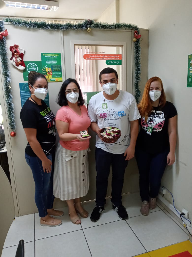 A supervisora do setor de Cobrança da Unimed Petrópolis, Maria de Lourdes Maia Dias, idealizou uma ação para sua equipe pela sua dedicação, ao longo de 2020. Como forma de agradecimento, os colaboradores ganharam um cartão de boas festas e um chocolate de brinde.