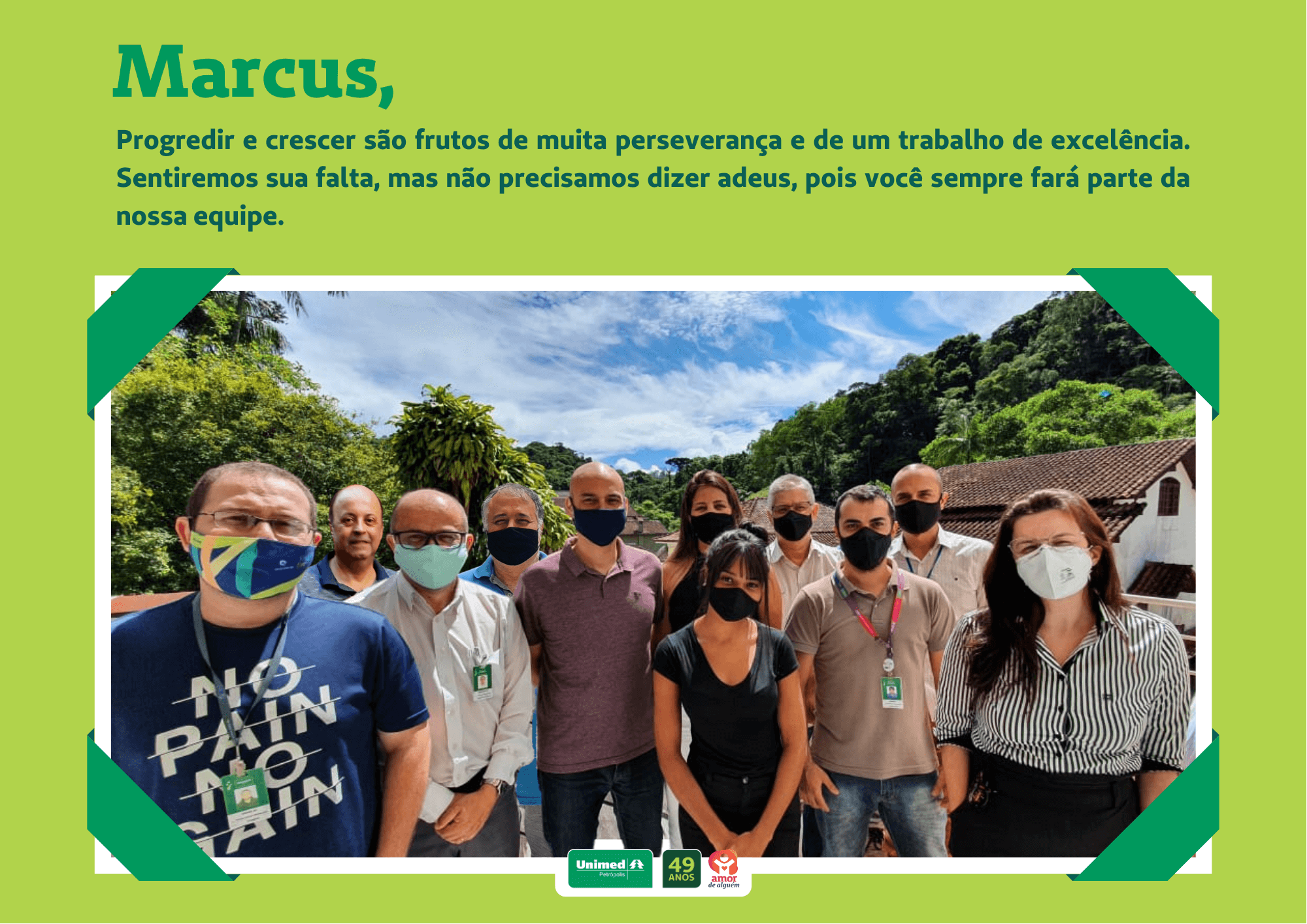 Os líderes promoveram um lanche e os presentearam com uma foto da equipe e uma mensagem de carinho para que sempre se lembrem dos colegas.