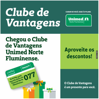 Os beneficiários da Unimed Norte Fluminense ganharam mais um benefício a partir do mês de junho. É programa Clube de Vantagens, o qual empresas parcerias da cooperativa médica oferecem descontos exclusivos aos beneficiários: Drogaria Modelo, Drogaria São Pedro (Bom Jesus), Drogaria Cidade, Cemedfit Academia (Centro), RJ Bikes, Drogaria Camila (Bom Jesus), Pharmacyst (farmácia manipulação), Farmácia Equilíbrio (manipulação), Cuidados Restaurante, Nutrivitta Produtos Naturais e lanchonete, Lion Bikes e Athletic Academia. Basta apresentar o cartão Unimed Norte Fluminense, RG e obter os descontos.