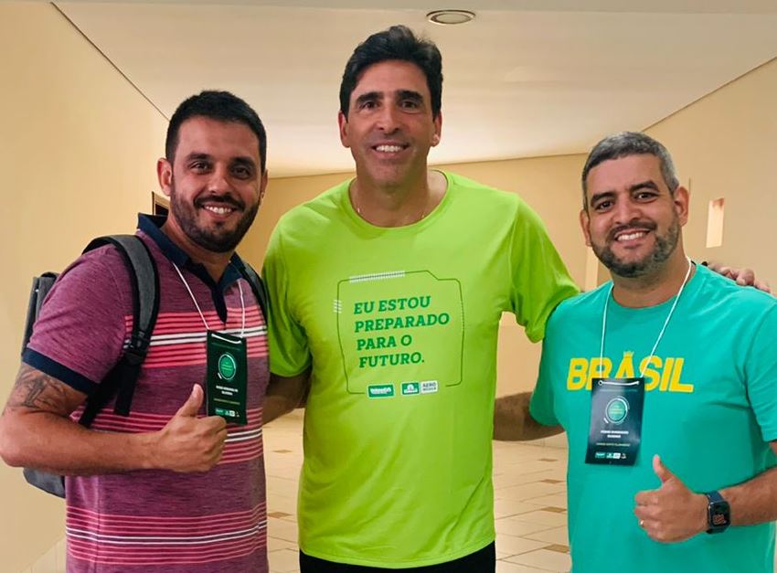 Na programação, houve palestras com temas como “O futuro nunca foi tão tangível”, “Como vender presencialmente na era digital”, “Casos de sucesso” e “A glória é fruto do trabalho”, com Giovane Gavio, medalhista de ouro olímpico do vôlei de quadra, na foto com Hugo e Pedro.