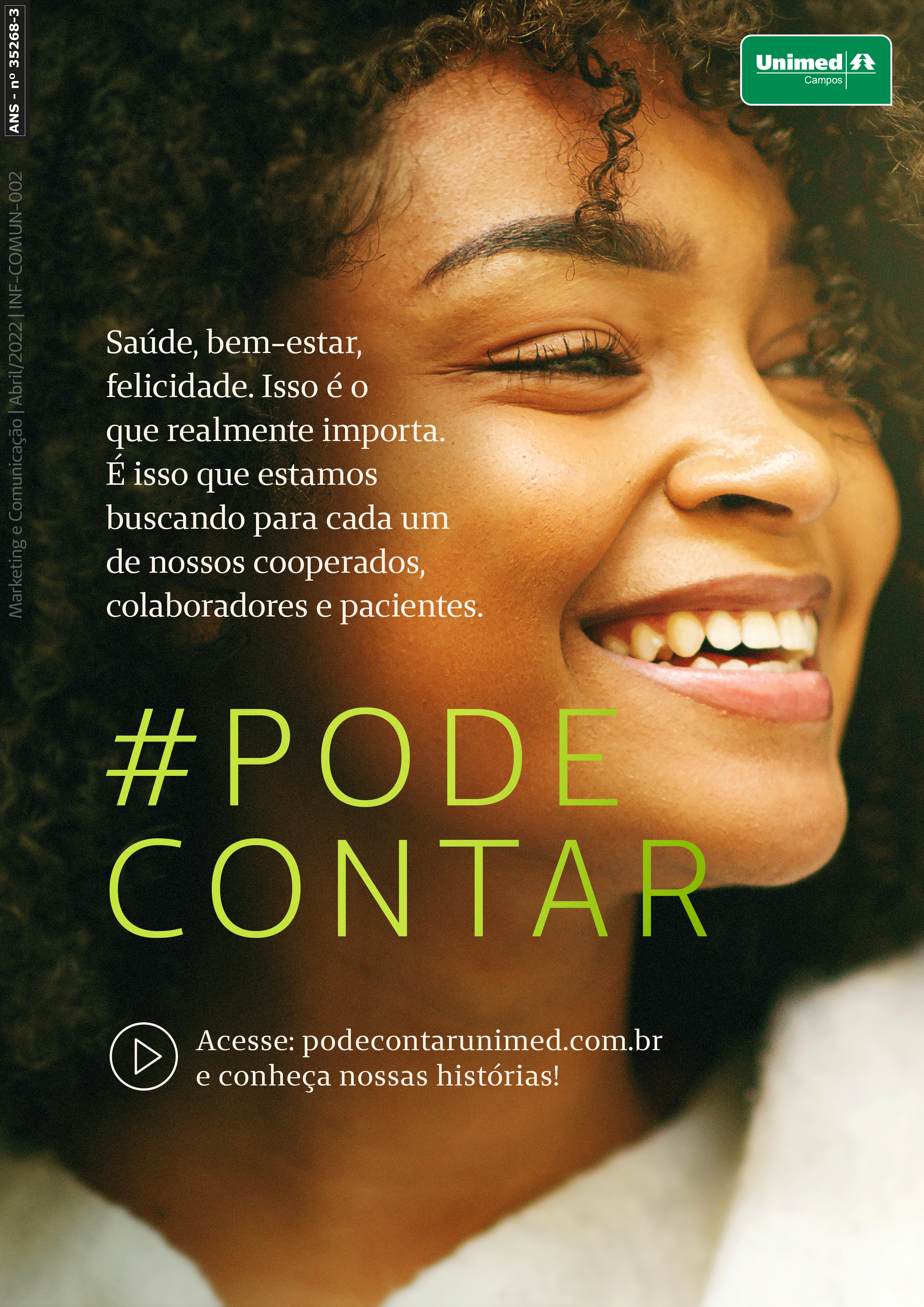 A resposta para esta pergunta é simples: oferecer mais que um plano de saúde, oferecer parceria, empatia, humanidade de verdade. É nisto que a Unimed Campos aposta com a campanha Pode Contar. Nessa campanha, que terá duração de dois anos, e que conta com diferentes mídias para divulgação, a Unimed Campos chega para reforçar: estaremos sempre com você, pode contar com a gente. E poder contar é bem mais que ter um plano de saúde. É saber que a Unimed Campos estará sempre trabalhando para oferecer o melhor, seja qual for a circunstância em que o paciente se encontra. É entender que toda a equipe e cultura da cooperativa são voltados a ajudar quando você mais precisar e solucionar problemas com dedicação e empenho. E nada melhor para mostrar essa relação de parceria, tanto com beneficiários quanto com cooperados e colaboradores, do que ter eles mesmos contando suas experiências. Uma experiência positiva vale mais que mil argumentos de venda, em especial em um momento em que a recomendação é um fator decisivo no processo de aquisição de qualquer produto ou serviço. Com esta campanha institucional, a Unimed Campos criará pontos de contato positivos com as vidas de todos os que estão à sua volta, sendo lembrada não só por situações de emergência e enfermidades, mas também pelas boas histórias. Pode Contar também quer dizer isso, é uma porta de entrada para que todos possam falar sobre a sua história.
