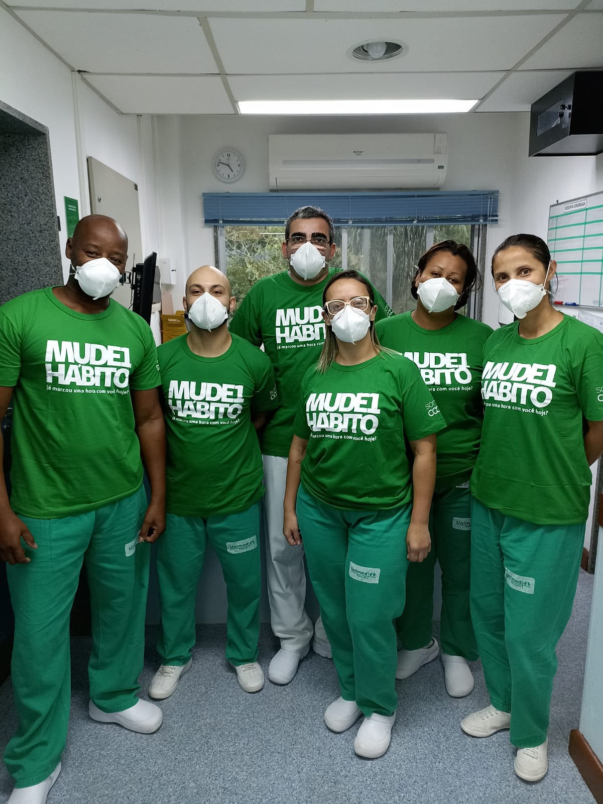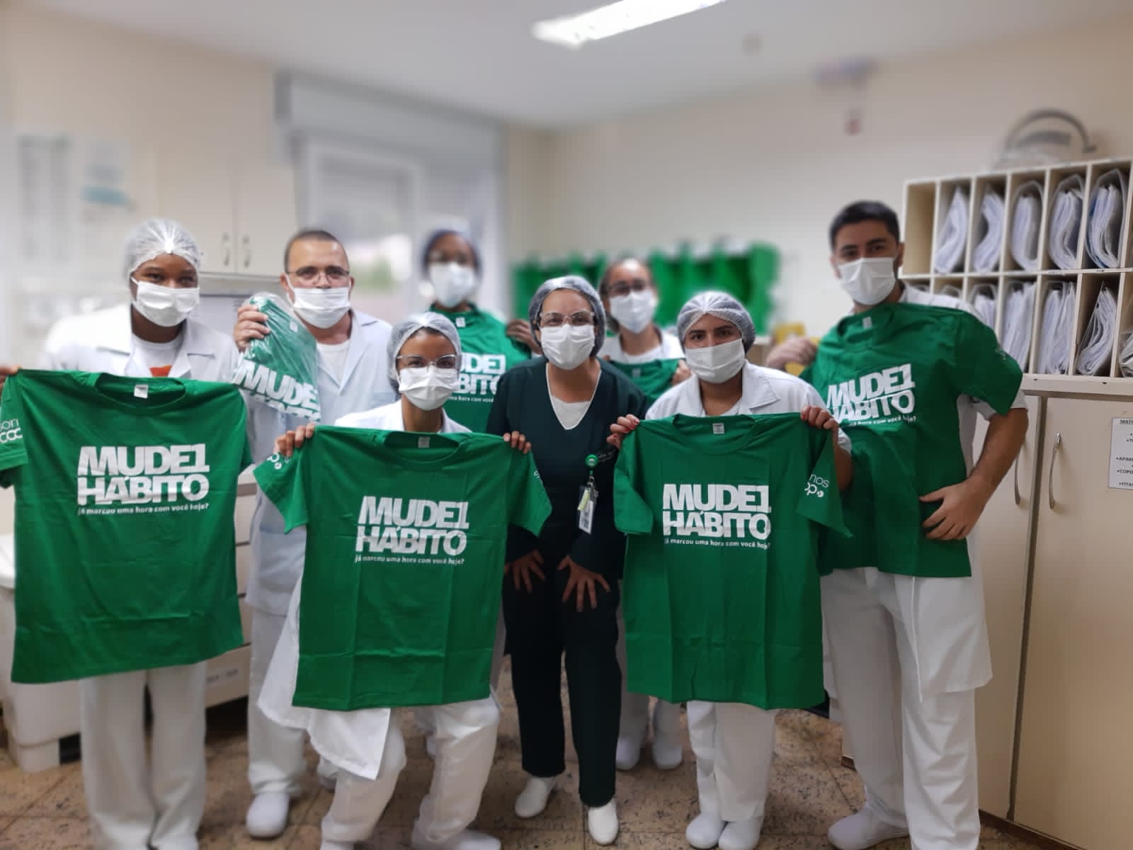 Foram distribuídas dezenas de camisas, bonés, máscaras e outros brindes comemorativos com o intuito de agradecer a esses profissionais essenciais para o cuidado com os pacientes.