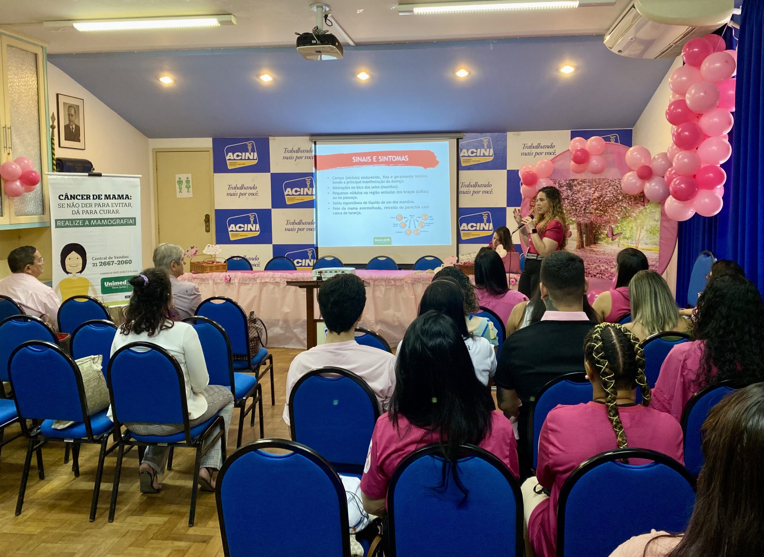 A Unimed Nova Iguaçu, representada pela enfermeira do Núcleo de Atenção à Saúde, Adkellen Beatriz, apresentou a palestra sobre prevenção do câncer de mama em campanha do Outubro Rosa, no auditório da Associação Comercial e Industrial de Nova Iguaçu (ACINI), no dia 26 de outubro. Organizado pela Prefeitura de Nova Iguaçu, o encontro contou, também, com a presença d gerente de Mercado da, Antonio Ferreira, com o coordenador de Comunicação e Marketing, Márcio Baptista e da secretária de Desenvolvimento Econômico da Prefeitura, Danielle Dias.