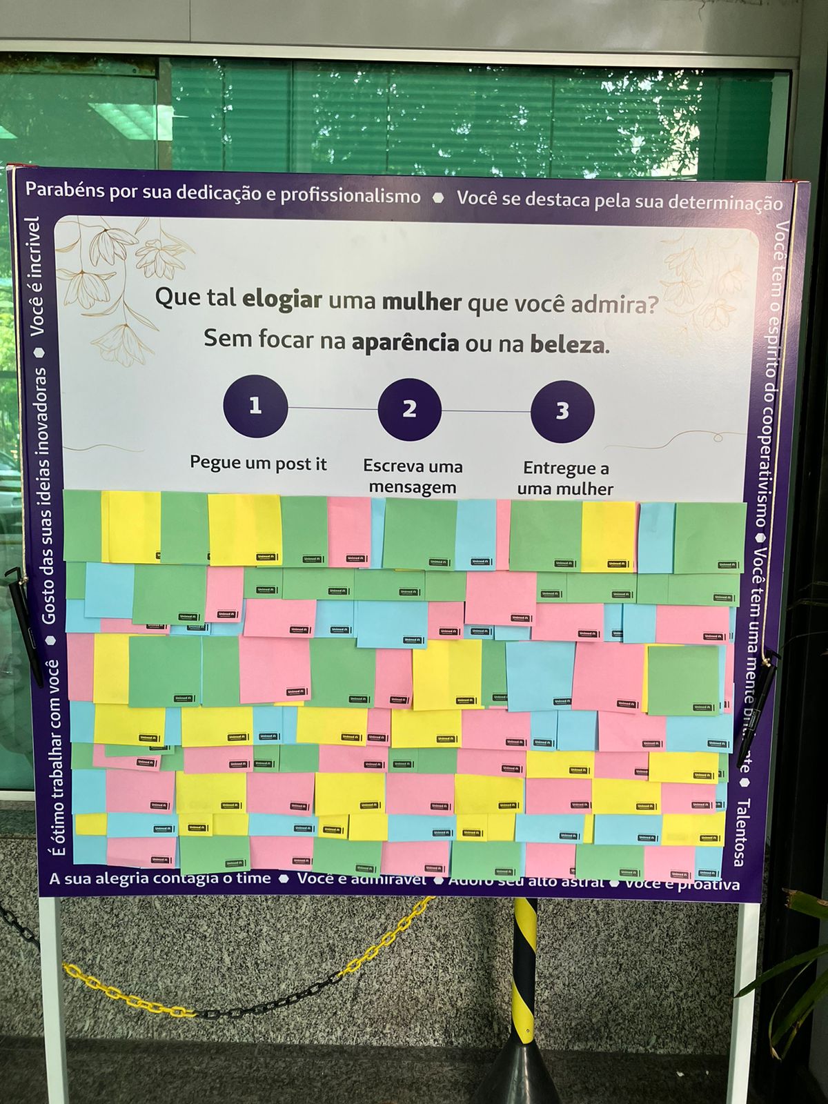 Pensar além do senso comum, quando se trata de elogios não é uma ação comum em nossa sociedade. Pensando nisso, a cooperativa lançou o desafio “Que tal elogiar uma mulher que você admira?”. Nesta dinâmica, os beneficiários e colaboradores elogiaram uma mulher admirável em suas vidas, sem focar na aparência. Para isso, os participantes retiraram um post it do quadro e escreveram um elogio, sem citar características.