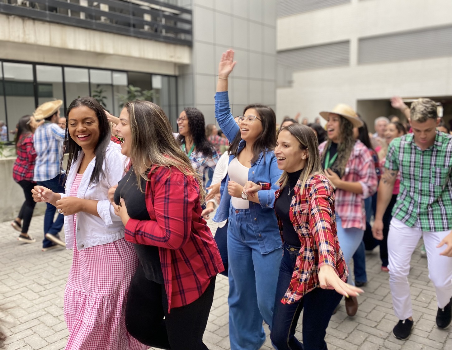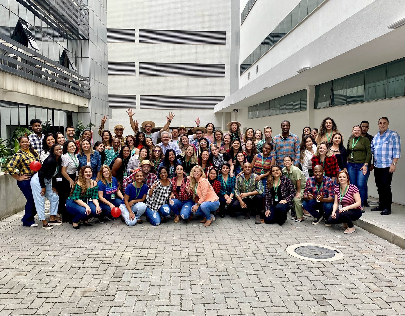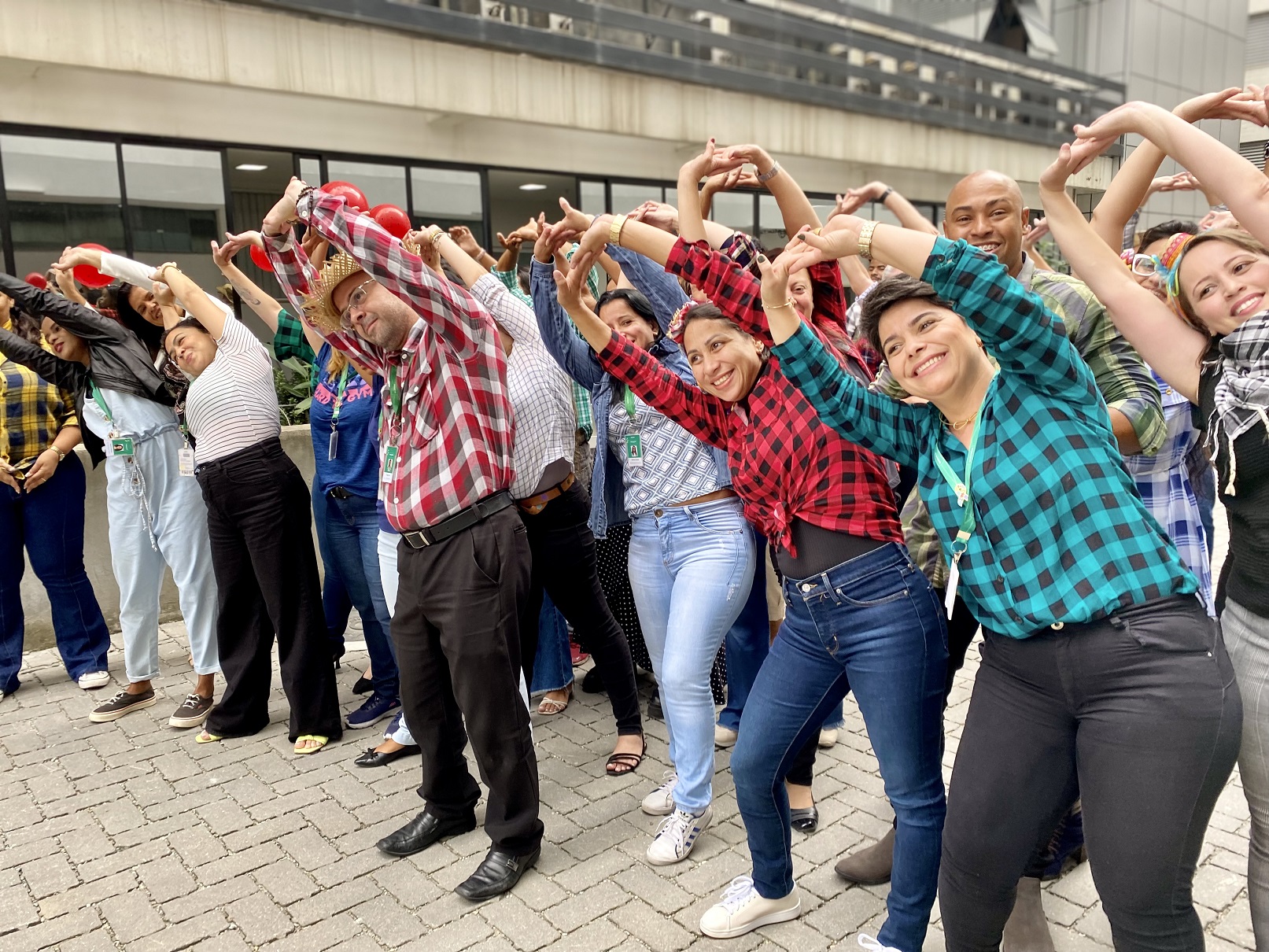 Dezenas de colaboradores participaram e se divertiram da ginástica laboral temática organizada pelo Núcleo de Atenção à Saúde (NAS), no dia 30 de junho, no pátio externo da sede Administrativa. Vestidos com roupas em xadrez, a música típica animou a atividade que objetivou promover o bem-estar, a integração e a alegria.