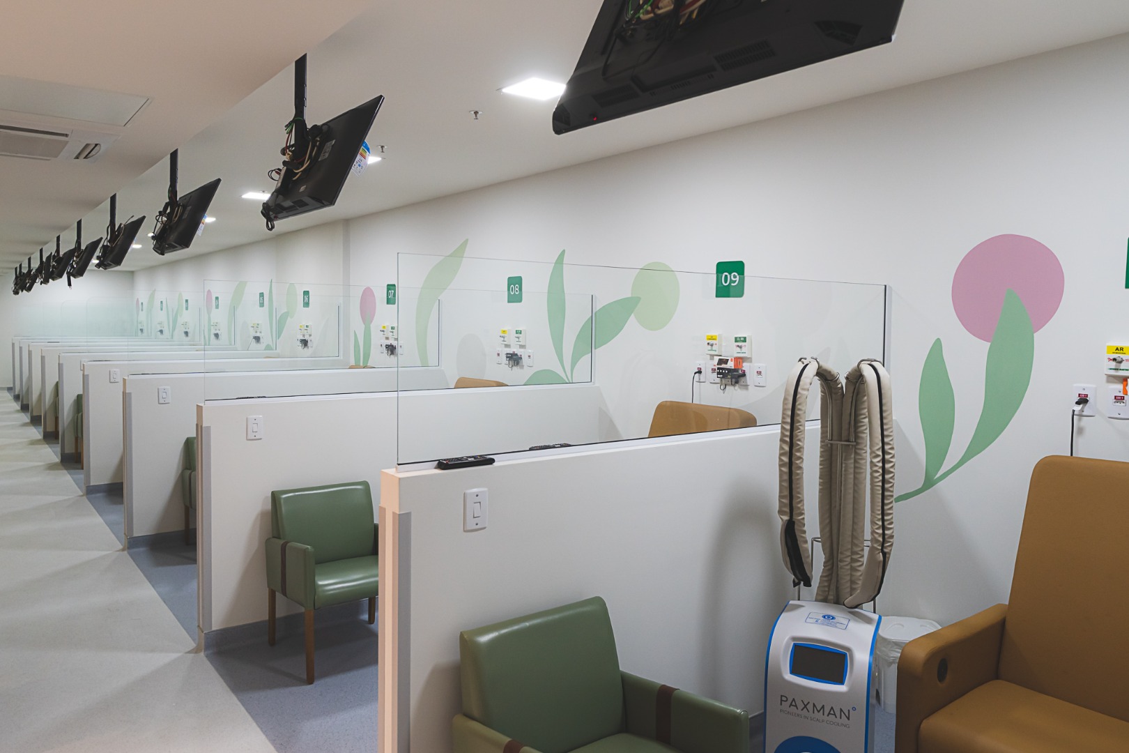 No Espaço Cuidar Bem Centro Oncológico da Unimed Nova Iguaçu o paciente conta, ainda, com a touca de crioterapia Paxman, tecnologia britânica que reduz a queda de cabelo em pacientes submetidos a tratamentos quimioterápicos, indicada pelo médico assistente em alguns casos. A unidade é pioneira na região a oferecer tal inovação tecnológica.