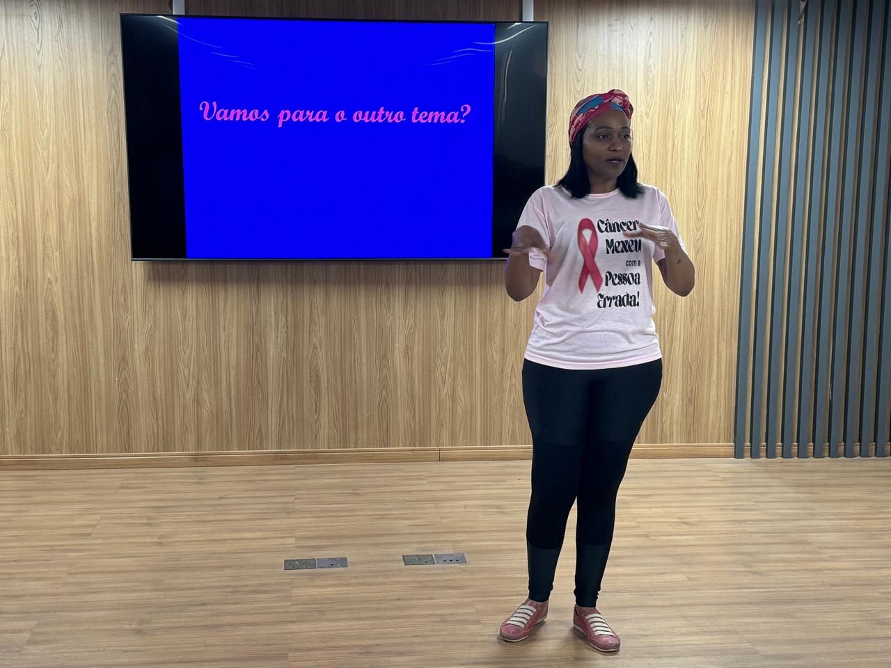 A médica trouxe uma sobrevivente do câncer de mama, Camila, para dar seu depoimento desde o início dos sintomas, diagnóstico e tratamento. Ao final do evento, as participantes tiveram a oportunidade de tirar dúvidas e receber orientações sobre como se portar nas consultas.