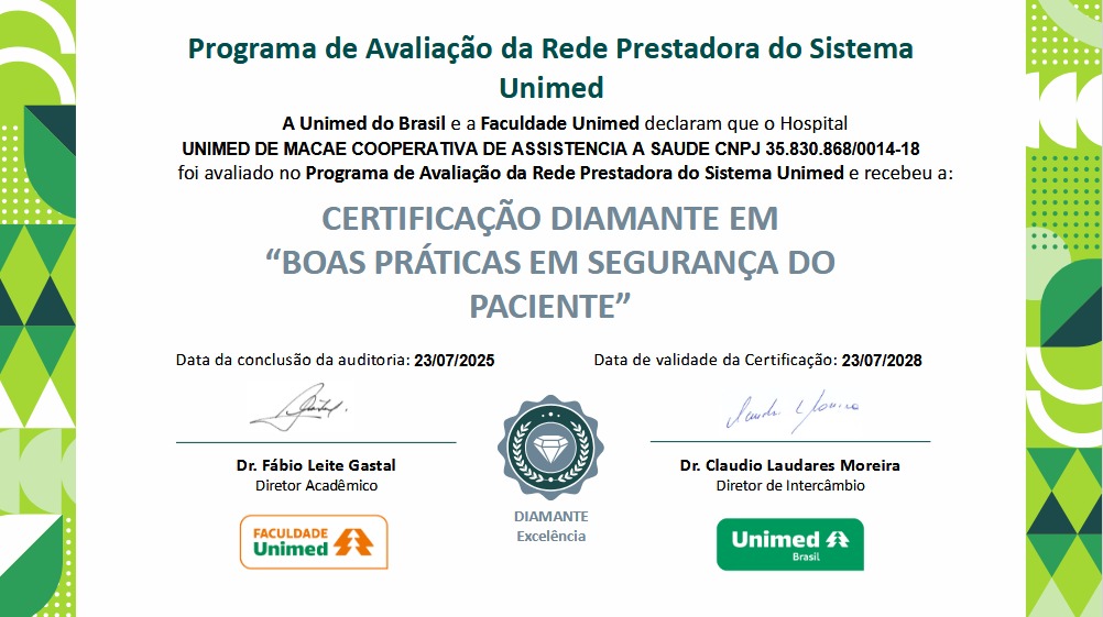 O Hospital Unimed Costa do Sol recebeu a Certificação Nível Diamante no Programa de Avaliação da Rede Prestadora do Sistema Unimed, na categoria Boas Práticas em Segurança do Paciente. O reconhecimento foi concedido pela Unimed do Brasil, em parceria com a Faculdade Unimed, após auditoria concluída em 23 de julho de 2025, com validade até 23 de julho de 2028.