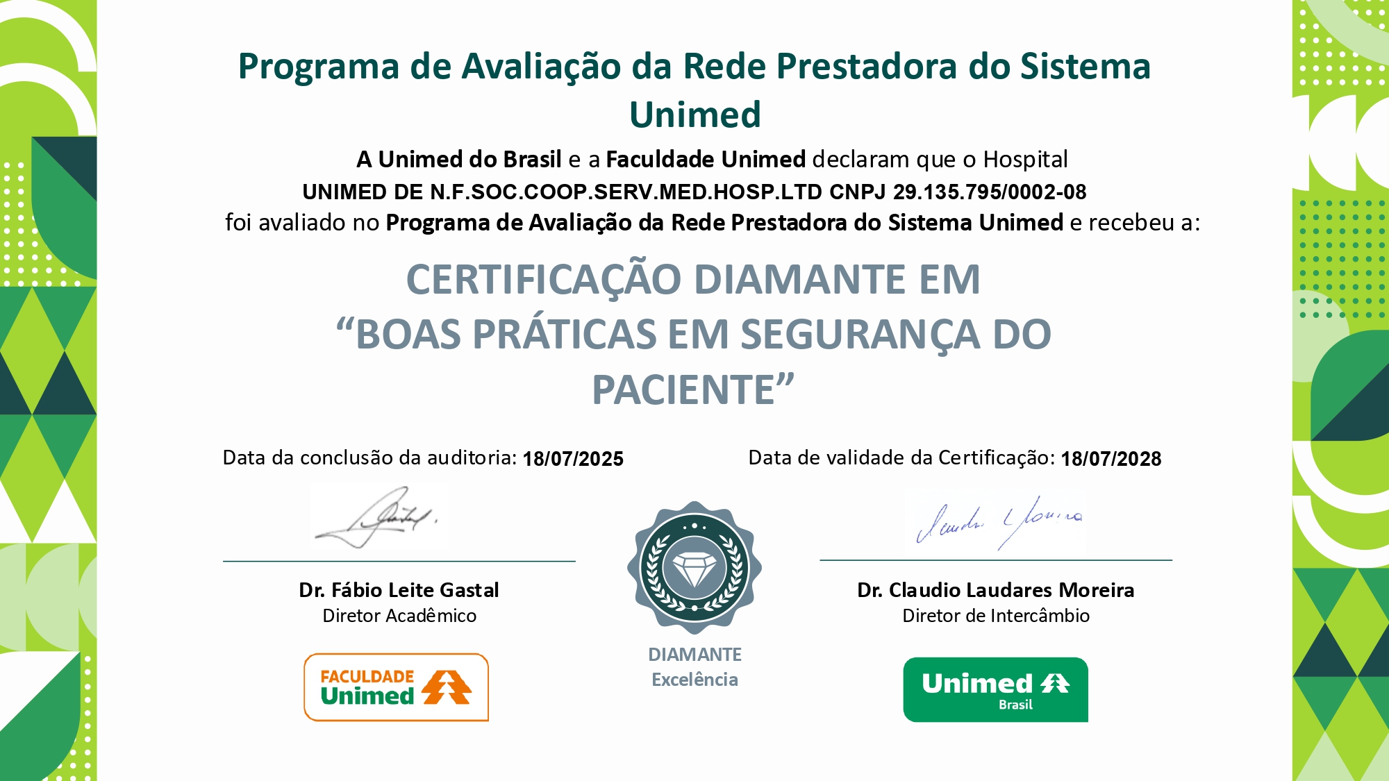 O Hospital Unimed Nova Friburgo recebeu a Certificação Diamante em Boas Práticas em Segurança do Paciente, concedida pela Unimed do Brasil. O reconhecimento é destinado às instituições que demonstram excelência na segurança do paciente e na cultura organizacional.