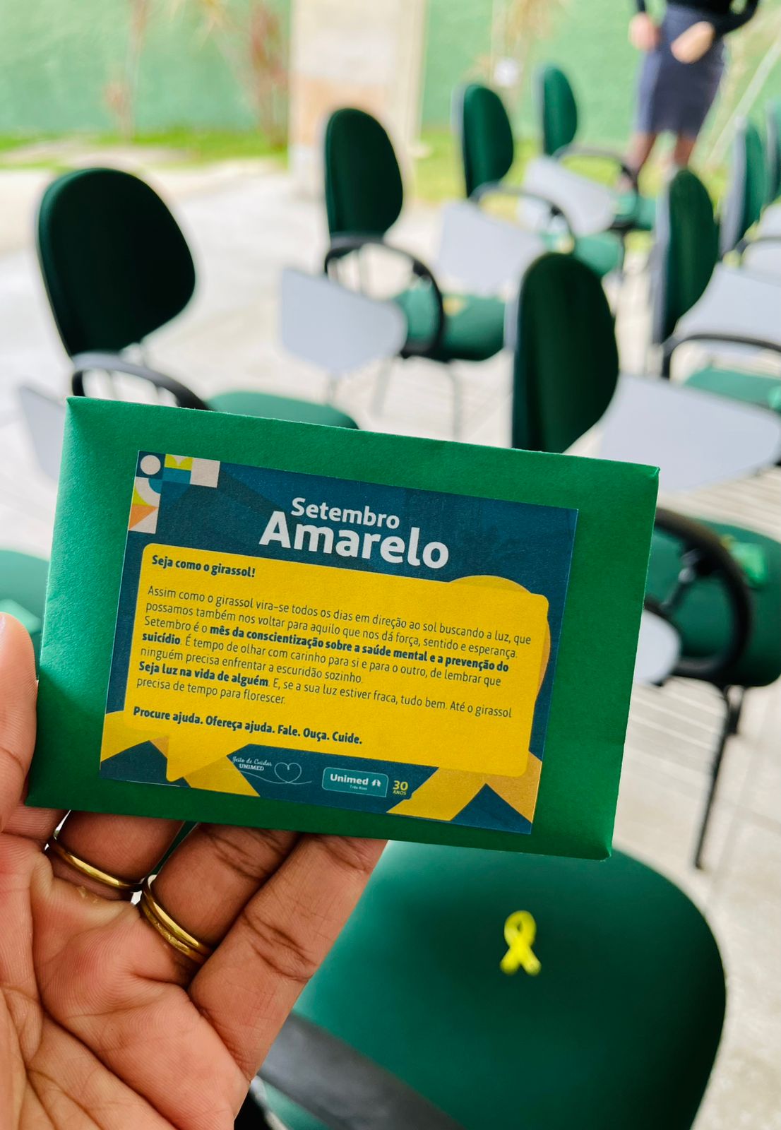 Durante o evento, foi entregue um cartão com uma mensagem motivacional sobre o girassol. “Ele representa a busca pela luz e a esperança em momentos de escuridão e adversidade, assim como a flor se volta para o sol para crescer. Valorize a saúde mental, busque apoio para um futuro melhor, mesmo nos dias mais difíceis”, explicou Patrícia.