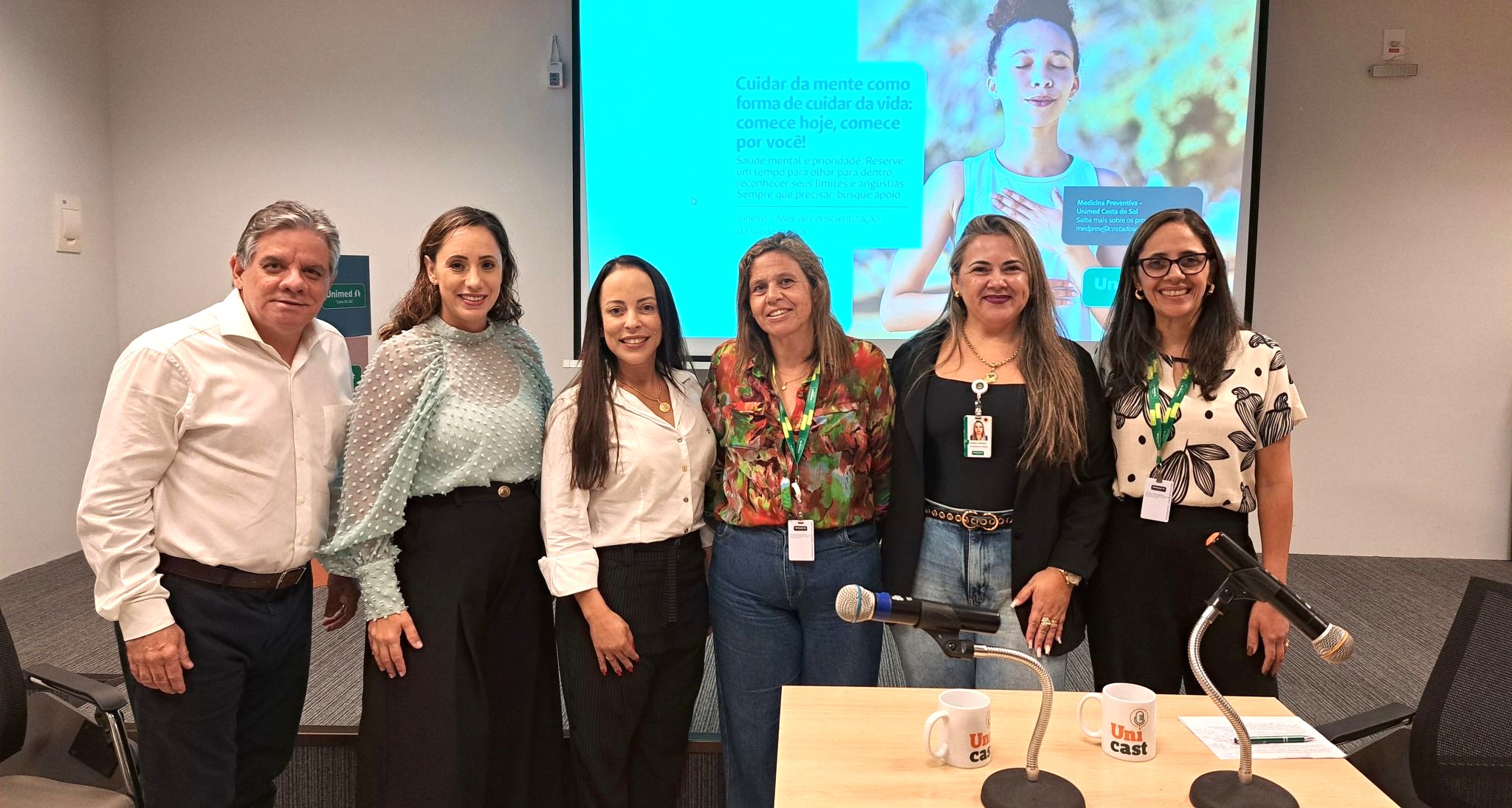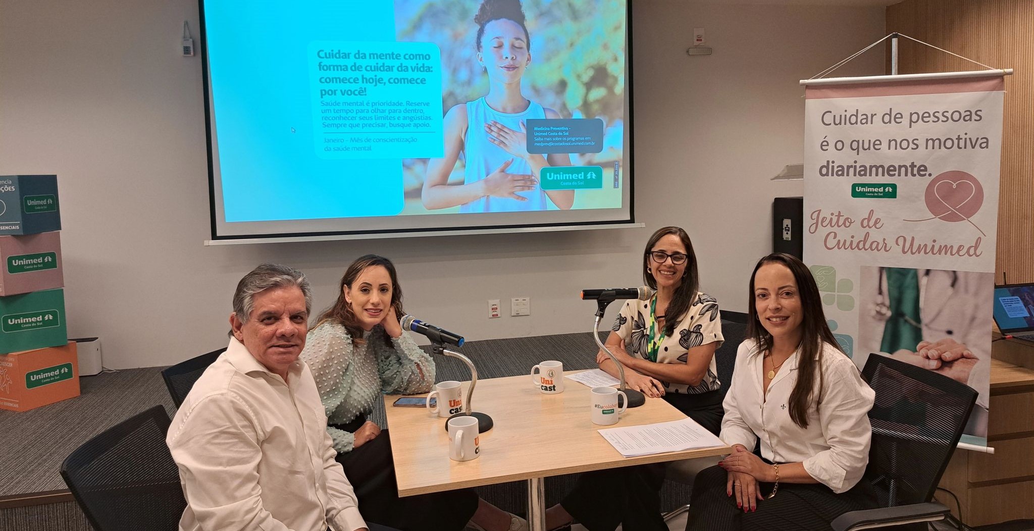 Falar sobre saúde mental é essencial para construir ambientes de trabalho mais saudáveis, humanos e sustentáveis. Em alusão ao Janeiro Branco, mês dedicado à conscientização sobre o cuidado com a mente, a Unimed Costa do Sol promoveu, no dia 20 de janeiro, a gravação de mais uma edição do Unicast, podcast que integra o projeto Uniessência, iniciativa voltada à promoção do bem-estar e da qualidade de vida dos colaboradores.