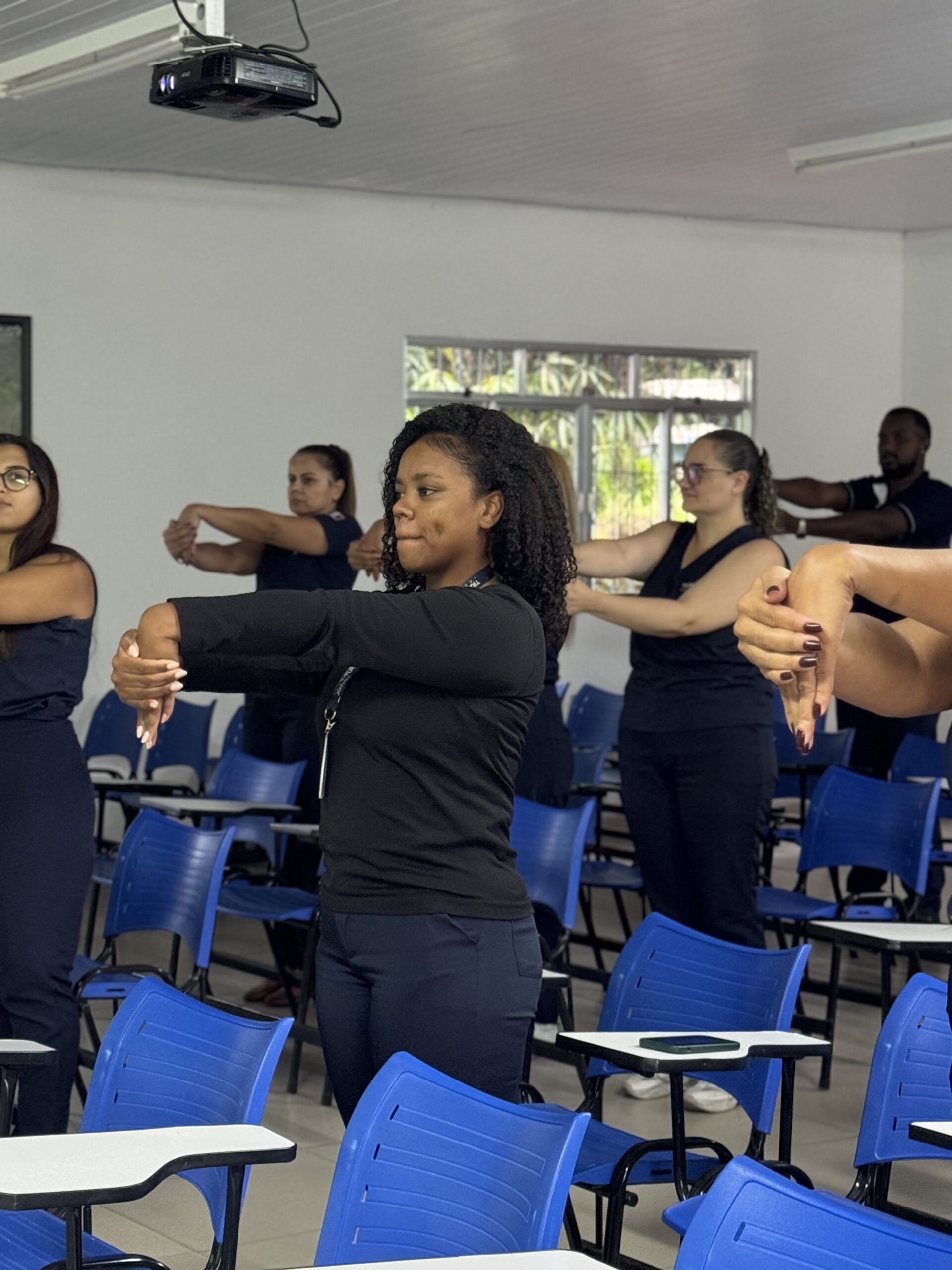 A psicóloga Rayla Bernardes conduziu uma palestra sobre saúde mental no cotidiano, com ênfase no ambiente de trabalho, abordando a importância do autocuidado e do reconhecimento dos próprios limites na rotina profissional. Em seguida, a fisioterapeuta Bruna falou sobre a relevância do cuidado com o corpo, destacando práticas simples como alongamentos e técnicas de descompressão muscular, especialmente para aqueles que passam longos períodos sentados ou em frente às telas.