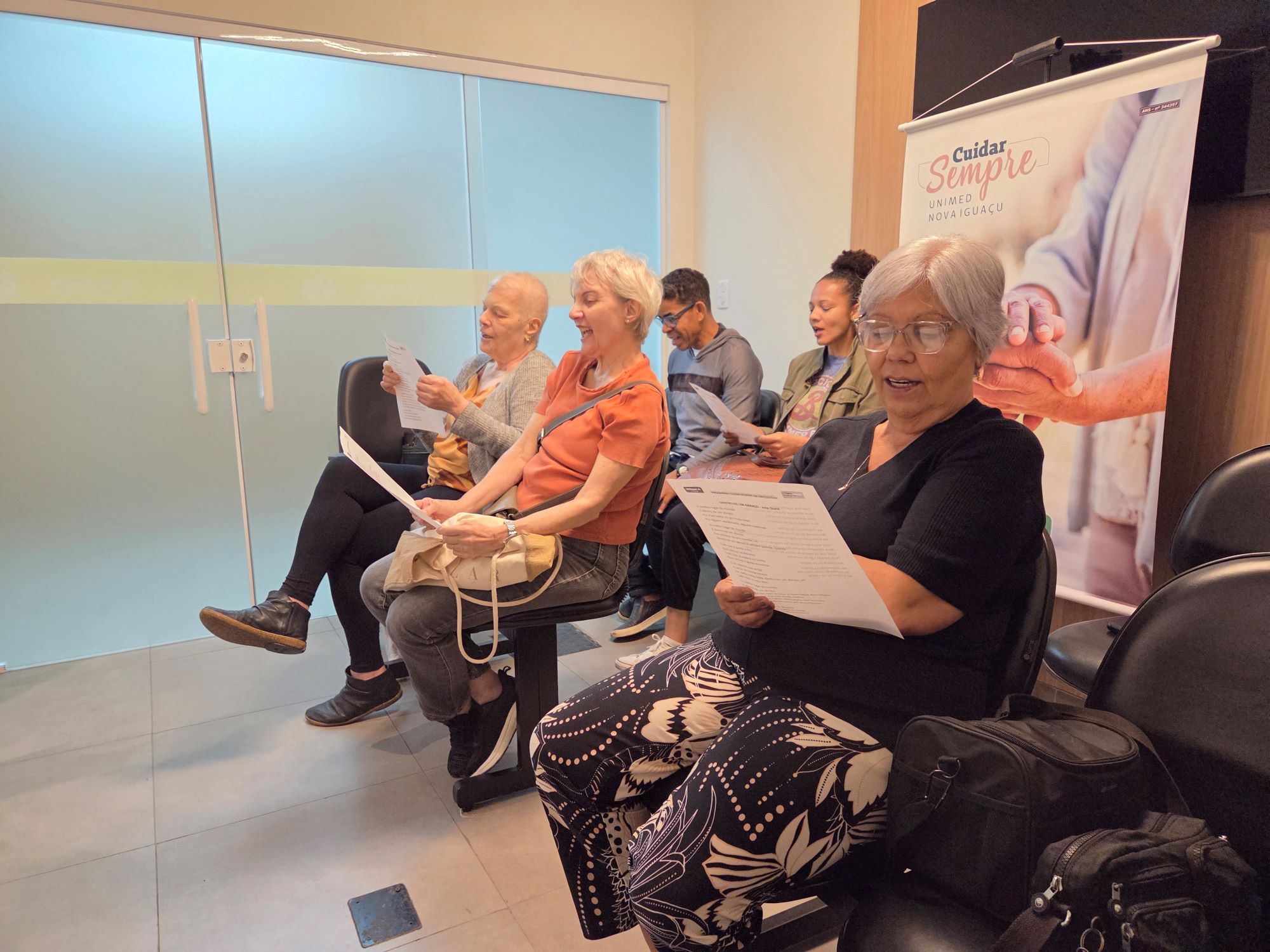Música, bate-papo, abraços, risadas e emoção temperaram o quarto encontro do Programa Cuidar Sempre que reuniu pacientes do Espaço Cuidar Bem Oncologia da Unimed Nova Iguaçu, no dia 21 de janeiro, na sede do Centro Oncológico. O encontro mensal visa ofertar acompanhamento contínuo e acolhedor aos beneficiários em tratamento e seus acompanhantes, por meio de ações que promovam a saúde física, mental e emocional em todas as fases da jornada oncológica.